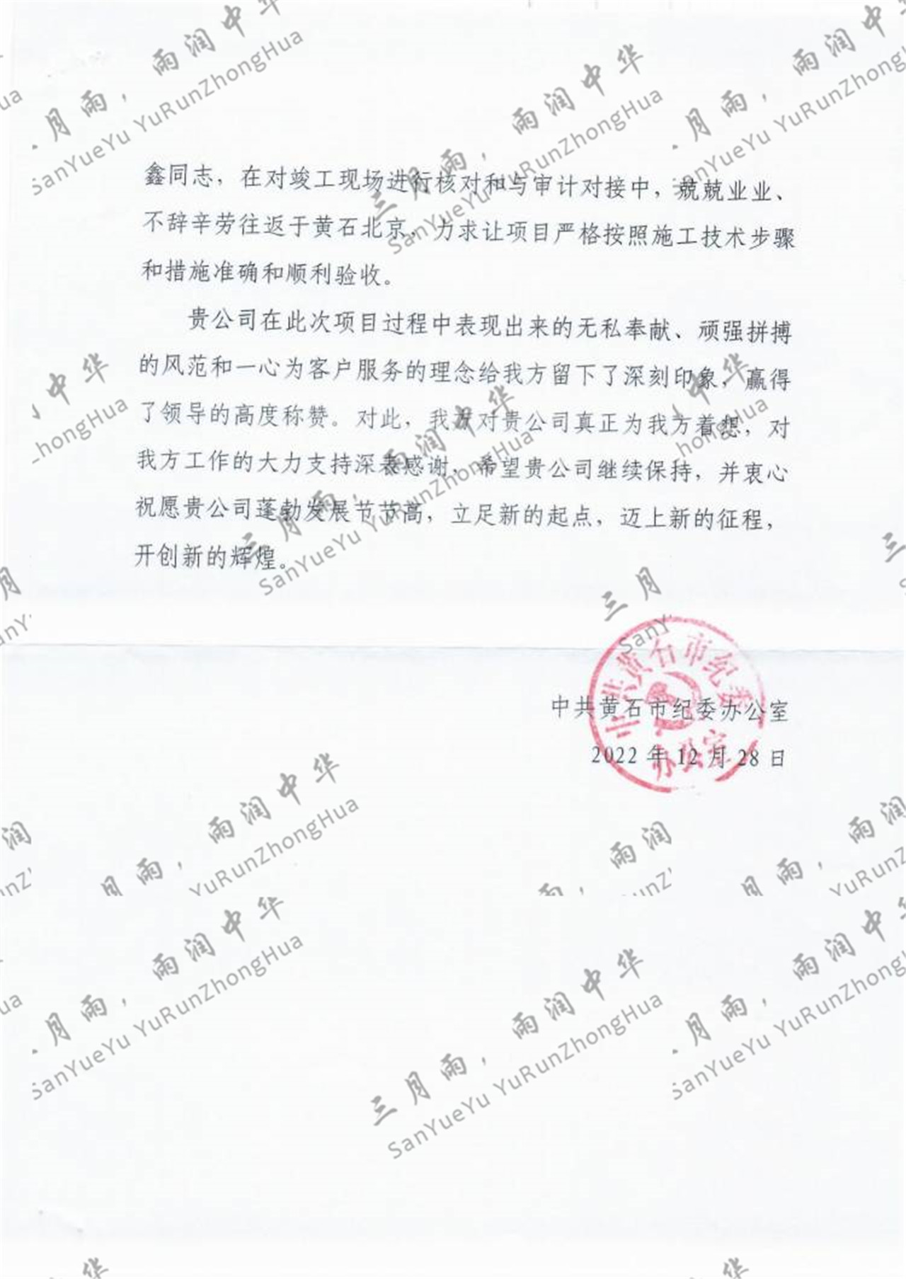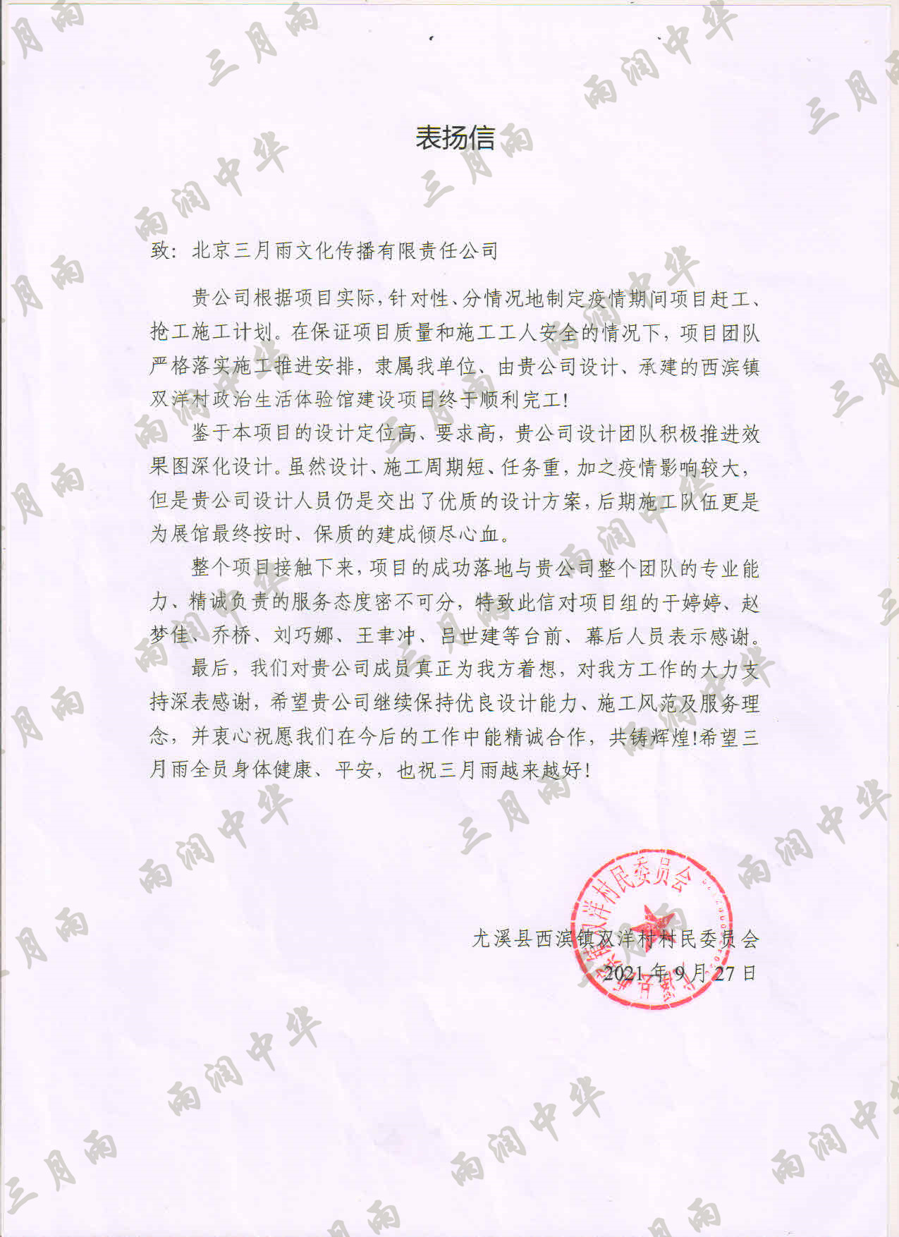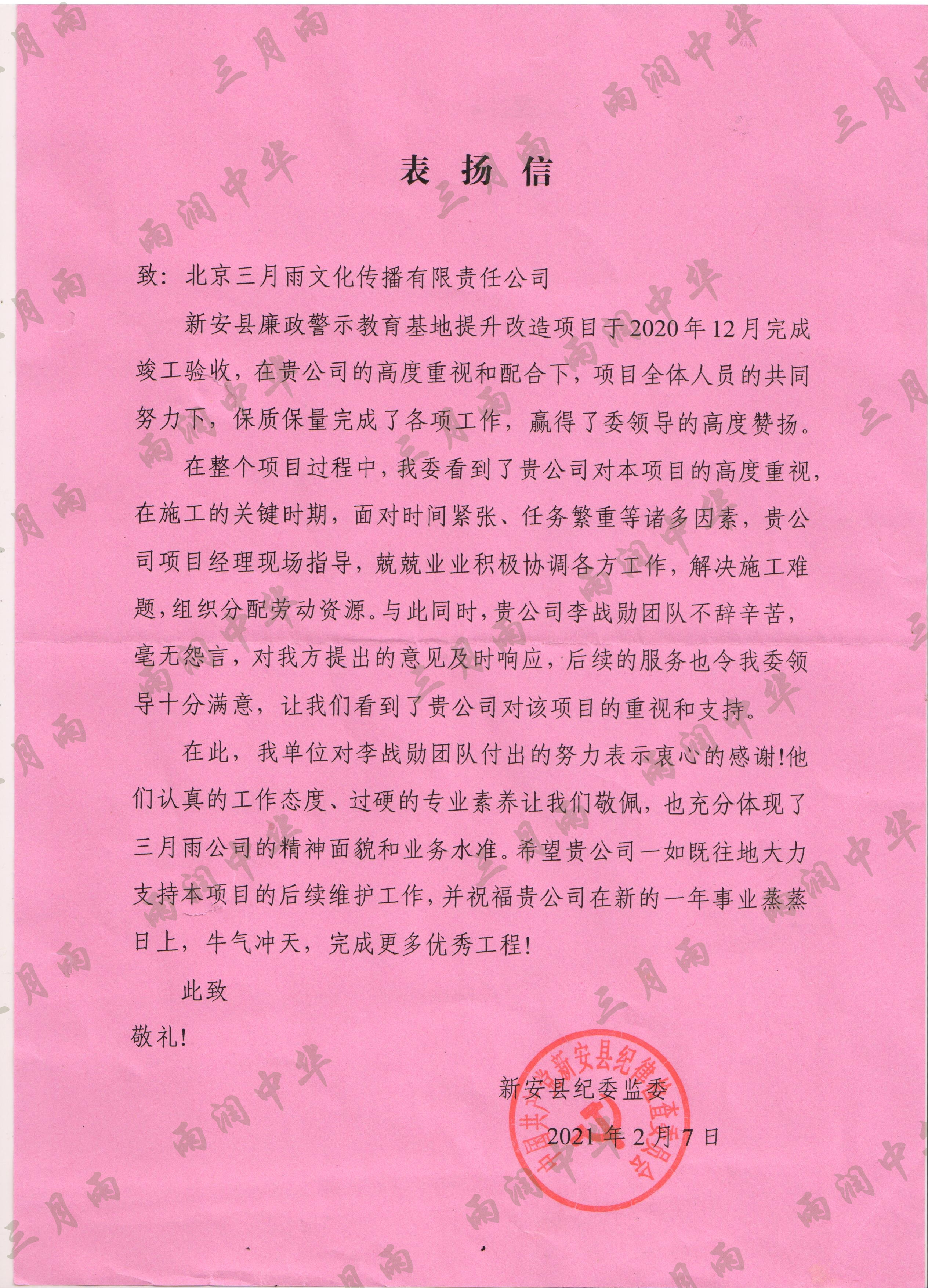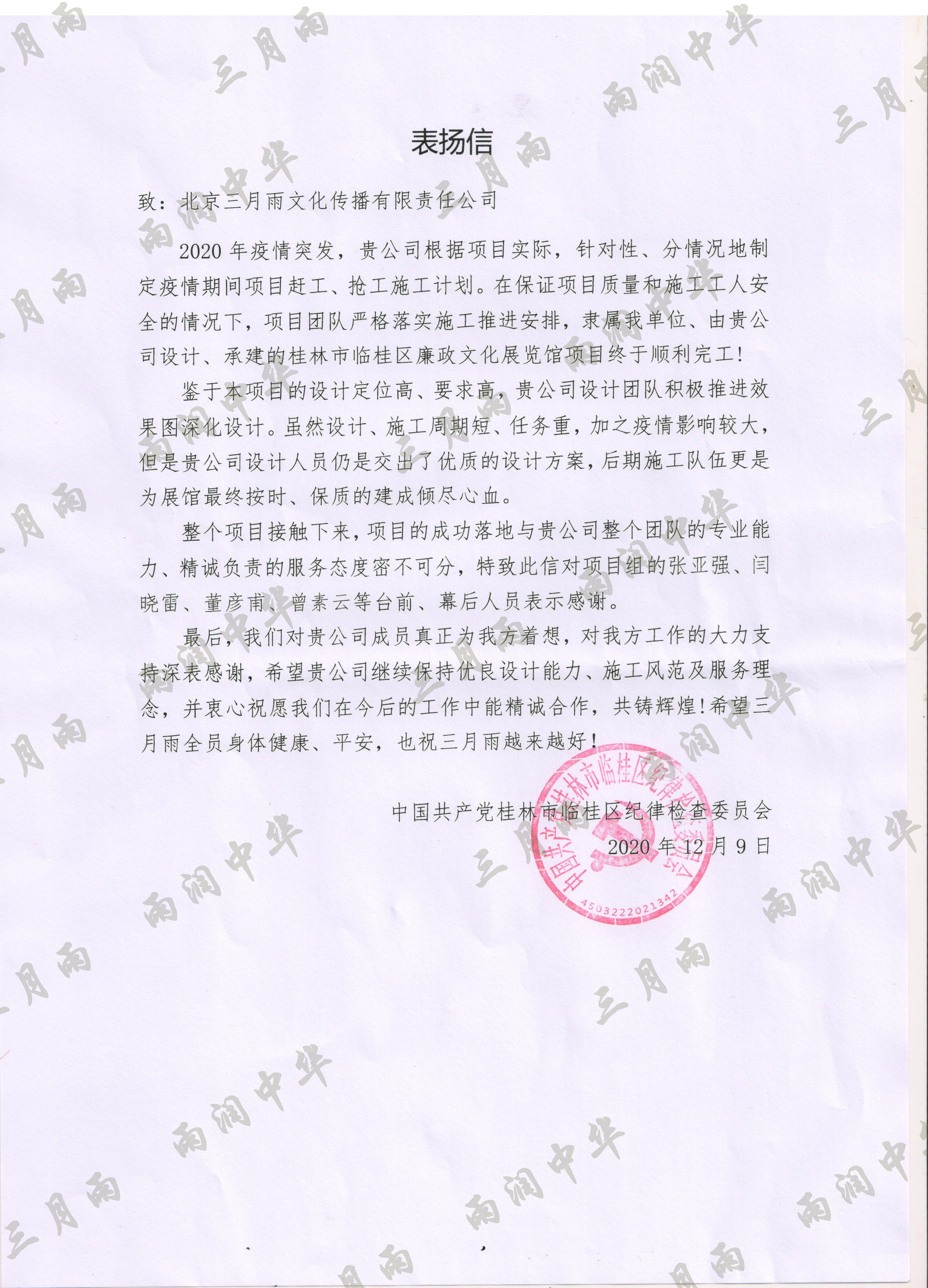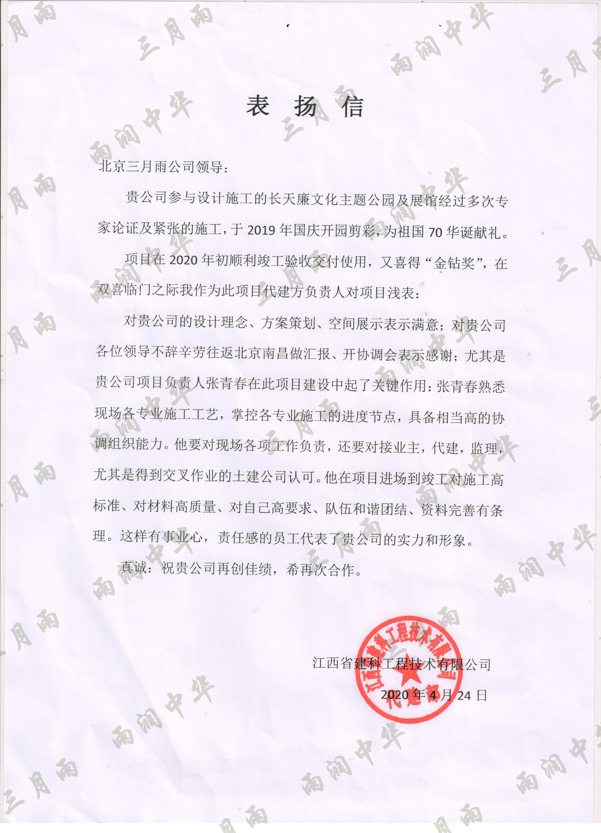 以质量求生存,以信誉求发展。公司既要“金杯”“银杯”,更要客户的口碑。每一个项目务求特色第一、质量第一、信誉第一,让客户满意。截至目前,共收到全国人大常委会机关纪委等国家机关和省、市、县级客户表扬信(感谢信)近