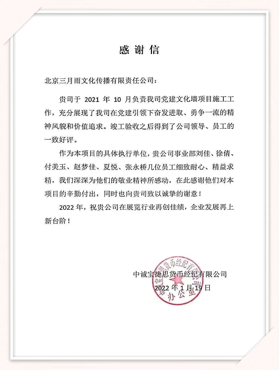 ▲ 1月21日,收到来自中诚宝捷思货币经纪有限公司感谢信