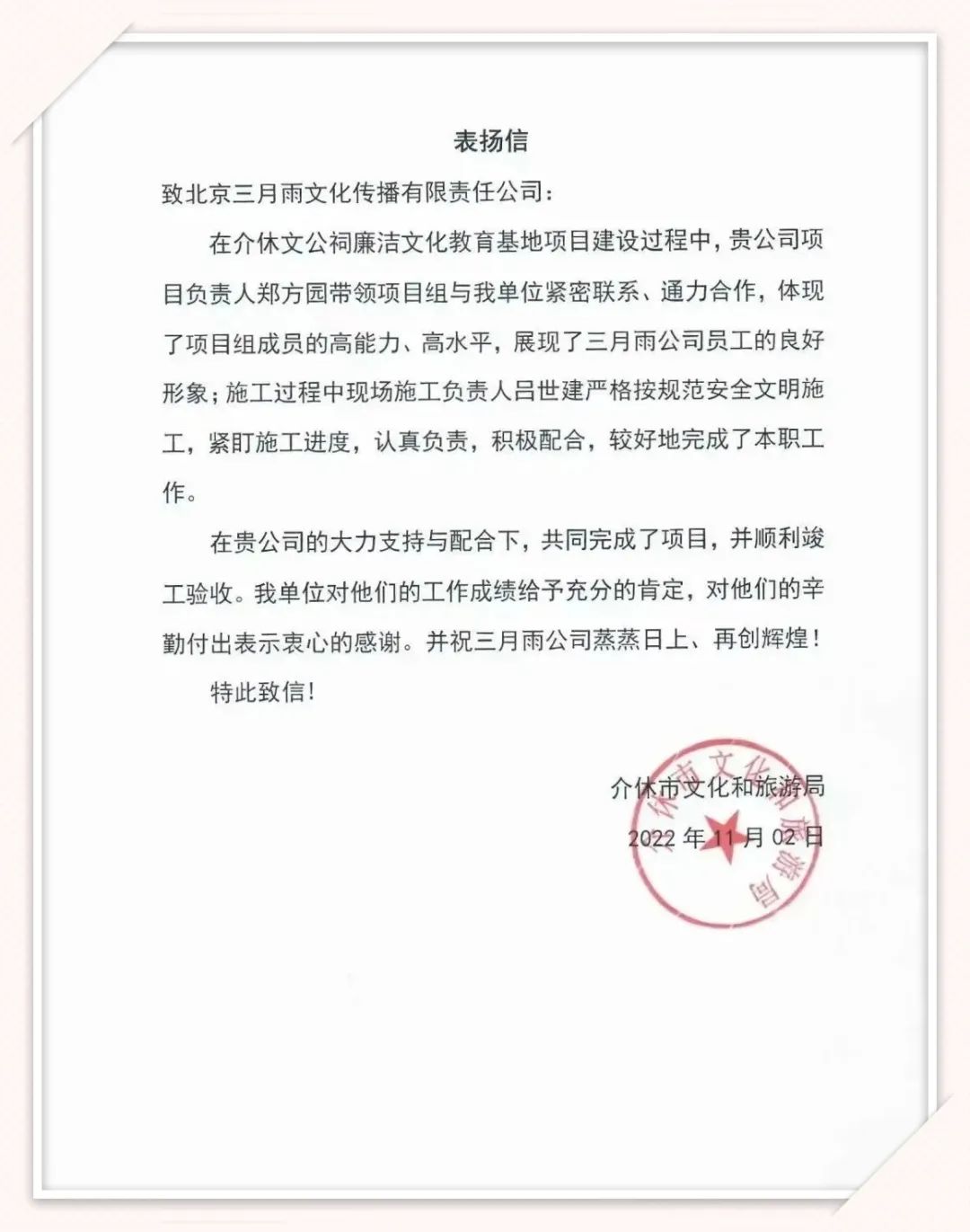 ▲ 11月4日,收到来自介休市文化和旅游局的表扬信