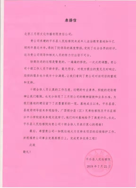 近日,集团收到了来自平乐县人民检察院的表扬信。信中对于我集团承建项目“平乐县人民检察院未成年人法制教育基地”的高质量展示效果予以肯定,并受到平乐县委、县政府领导肯定及赞誉。