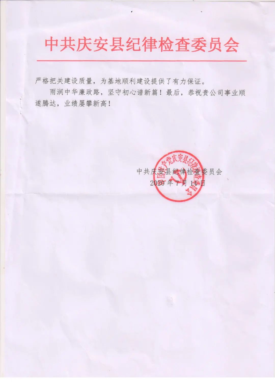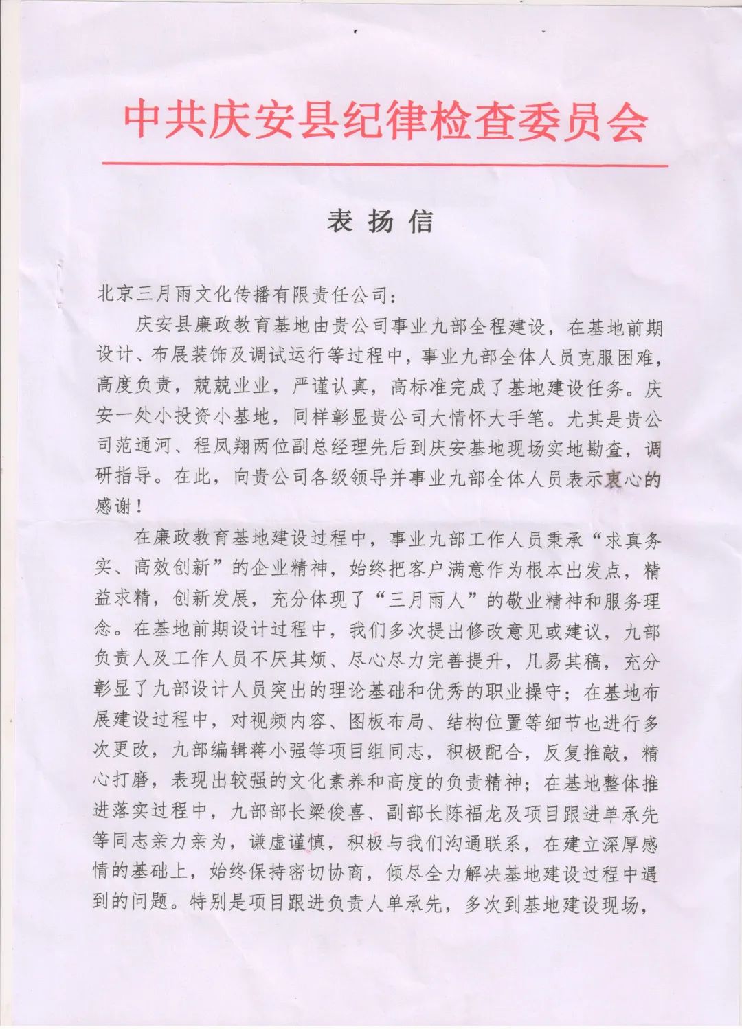 8月10日,三月雨集团收到来自中共庆安县纪委的表扬信,点赞三月雨项目团队精益求精、勇于创新的工匠精神。