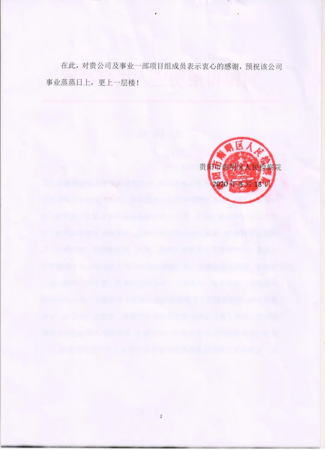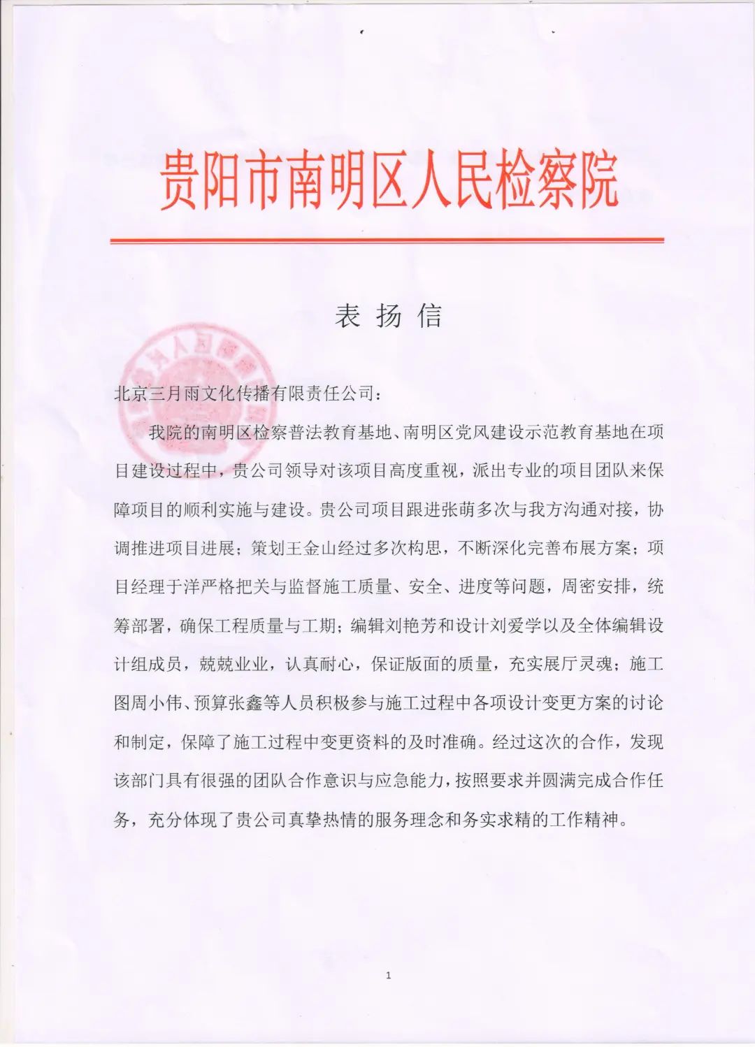 8月27日,一封来自贵阳的表扬信寄到了三月雨集团办公室。贵阳市南明区人民检察院对三月雨承建教育基地过程中所体现出来的敬业精神给予了高度赞扬。