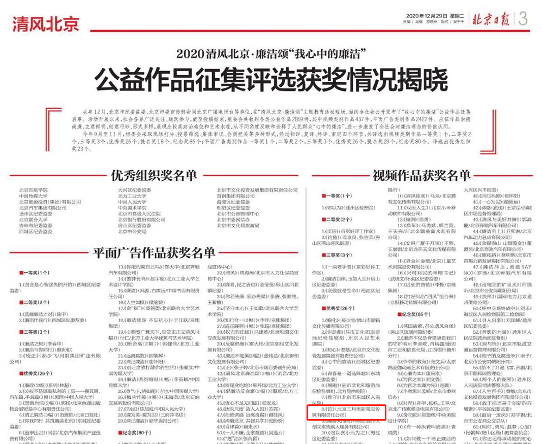近日,由北京市纪委监委、北京市委宣传部、北京广播电视台等单位主办的“清风北京·廉洁颂”主题教育活动作品评选出炉。三月雨集团新视觉公司策划、拍摄、制作的公益短片《钓》荣获本次大赛优秀创意作品奖。