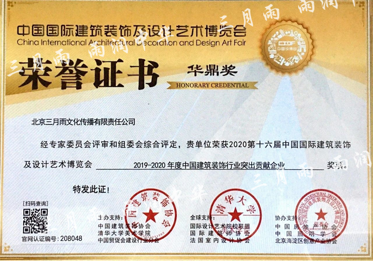 近日,中国建筑装饰协会、中国建筑装饰协会环境艺术分会公布了第十六届中国国际建筑装饰及设计艺术博览会“华鼎奖”评选结果,三月雨集团荣获本届“华鼎奖”大奖——“2019-2020年度中国建筑装饰行业突出贡献企业”。