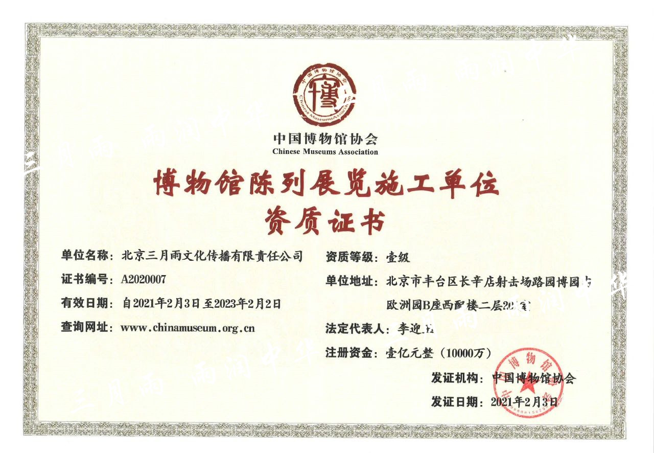 喜讯!三月雨获2020博物馆陈列展览设计、施工一级资质