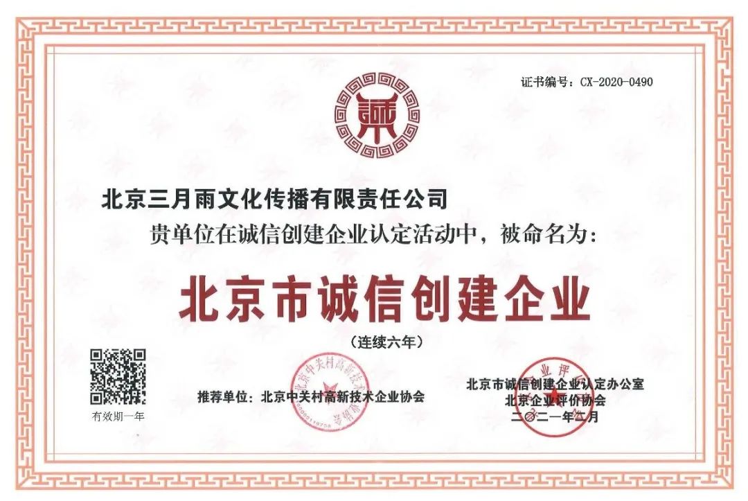 北京市诚信创建企业认定办公室共评选出49家文化类企业,三月雨凭借在展览展示设计建设领域诚信经营的优良表现,连续六年获评“北京市诚信创建企业”称号,充分体现了政府、行业、协会对三月雨诚信经营、守法经营良好形象的认可,也体现了业界对三月雨十八年深耕展览展示行业所作努力的肯定。
