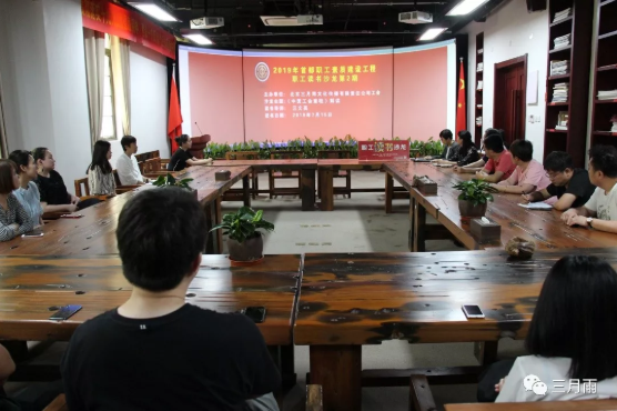 2019年7月15日中午,三月雨集团工会在211会议室,举办了 “2019年首都职工素质建设工程”第二期读书沙龙——《中国工会章程》解读分享活动。海淀区万寿路街道工会副主席、三月雨工会主席汪文英等集团领导和40多名工会成员参加了活动。