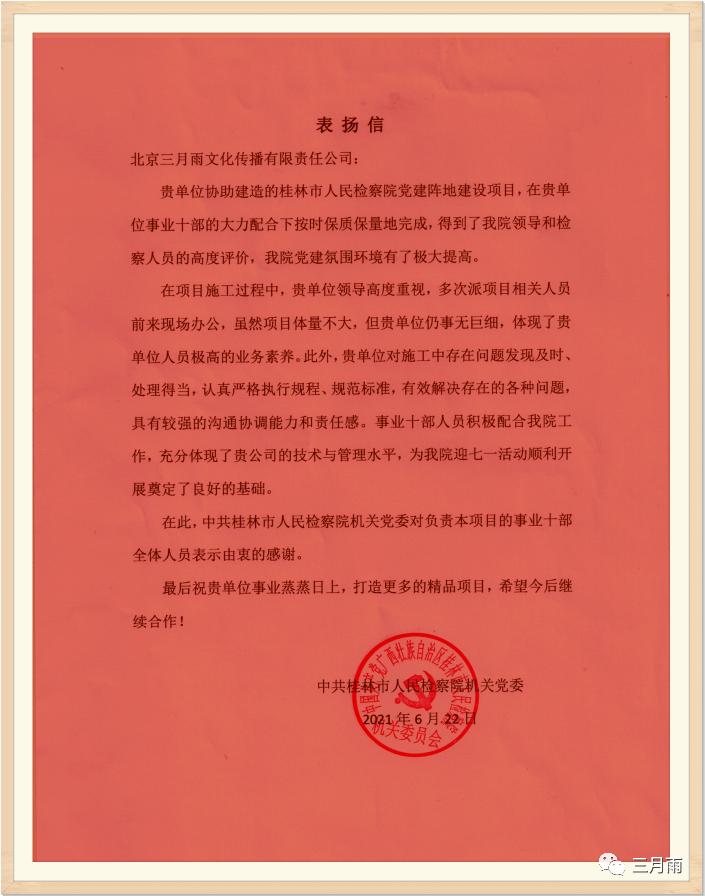近日,三月雨协助建设的桂林市人民检察院党建阵地项目,得到了该院领导和检察人员的高度评价,为此,桂林市人民检察院机关党委特发来一封表扬信,以此表示对三月雨项目团队工作的认可与肯定。