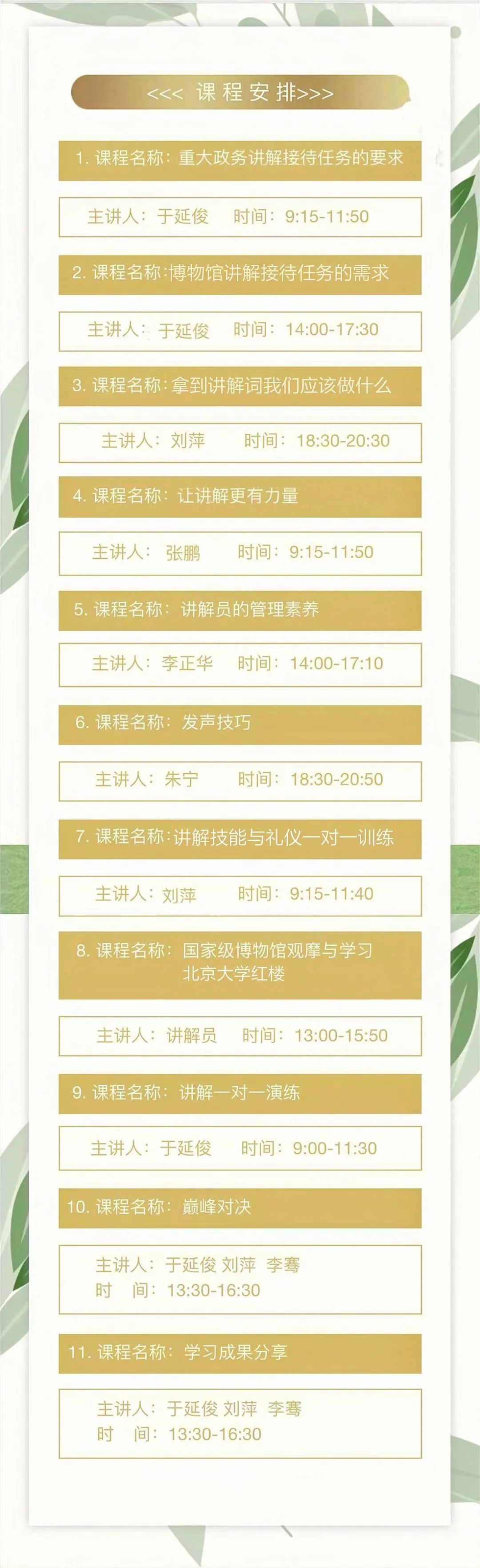 第三个特点,是“精”,课程的设计,可谓是萃取了精华,在短短五天的时间里将讲解员所必备的知识储备进行了传播。