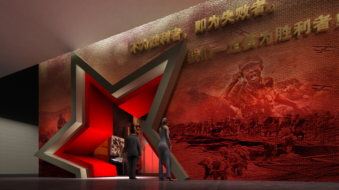 以五星造型设计成门洞造型,与墙面浅浮雕衔接,形象的表达主题,通过让造型“说话”,灯光营造氛围,渲染叙事感,展现红军在中国共产党的领导下艰苦卓绝的光辉历程。